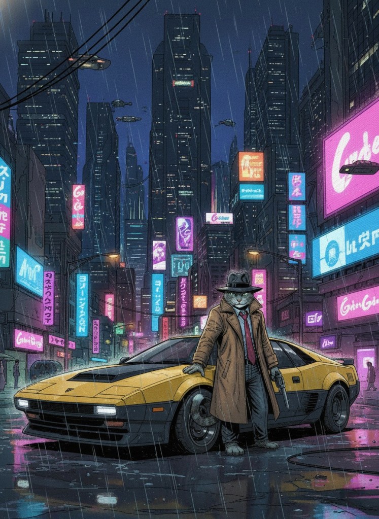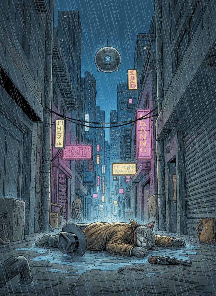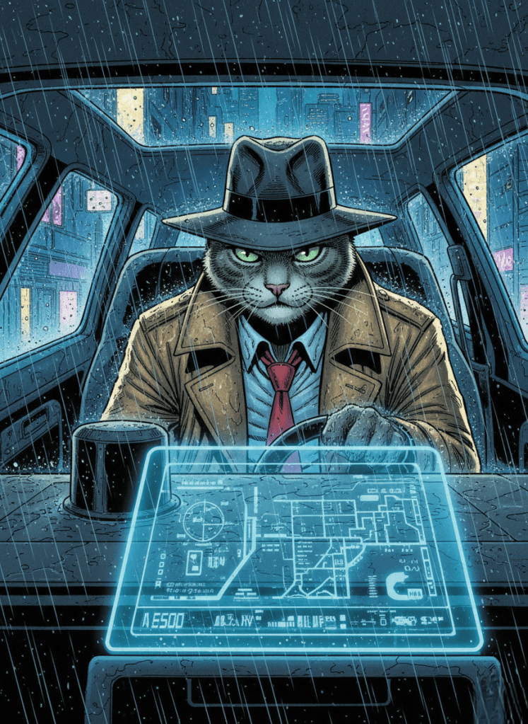 It was pouring by the time I pulled up near the corner of Tortoiseshell Street and Burmese Boulevard. I padded out of the warm comfort of my ride, the Budmobile, and told it to watch my back. The Budmobile’s AI chimed in acknowledgement and miniature silos opened on each rear quarter panel, ejecting a pair of drones. One drone circled above me in a defensive posture while the other zoomed ahead, scouting my path.
