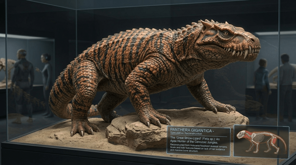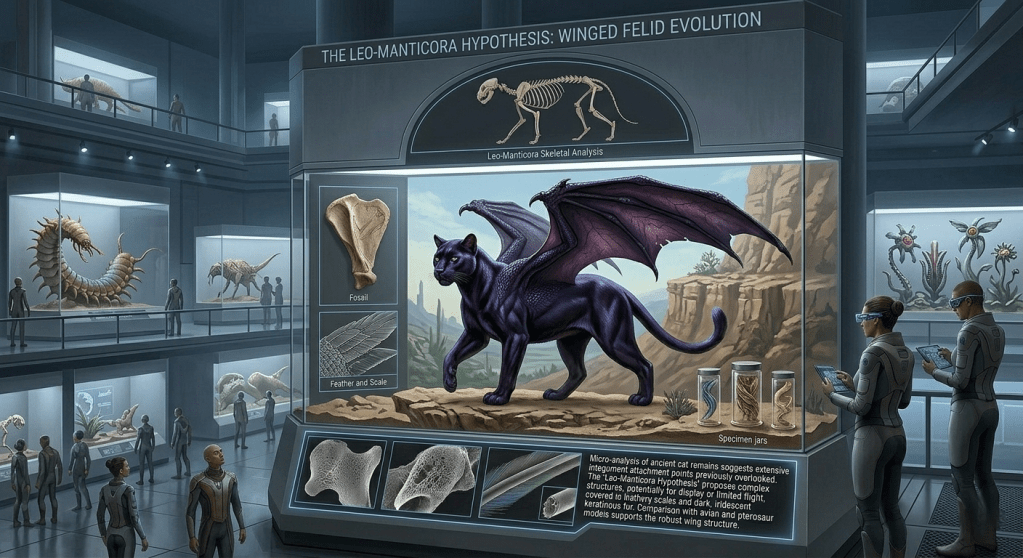 Critics have long argued that our depictions of dinosaurs are like skeletons wrapped in flesh, with modern representations doing a poor job of representing complete animals. What if the paleontologists and historians of the future mistranslate a word like “fur” or don’t realize the skeletons of cats are the same furry creatures that were human companions?A tiger imagined as a semi-aquatic animal with scales instead of fur, and a skull interpreted in much the same way we interpret dinosaur skulls. “Surviving texts make clear the tiger was comfortable in water, and like its distant cousin the crocodile, would remain mostly submerged, looking for opportunities to ambush prey.”No fur, just musculature, as if an anatomy book of animals is one of the few texts to survive in hard copy.A cat with magnificent plumage: “Research shows felines engaged in elaborate mating rituals, using their vivid colors and patterns to demonstrate virility to females in heat.”Finally, a winged cat. Outlandish? Maybe. But what if of the scraps of mythology to survive is a statue of a manticore, or paleontologists discover the bones of a cat species mingled with those of a large bird that died alongside it in a tar pit? In our time we’ve accidentally invented entire species of dinosaurs by mistakenly matching skulls from one species onto the spines of others, or wildly misinterpreting clues in the body plans of new and unfamiliar creatures.